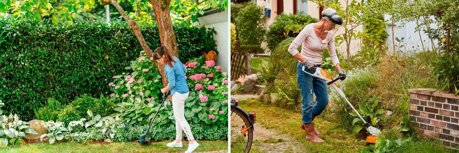 Если выбирать триммер для женщин, то рассматривать стоит только аккумуляторные и электрические модели. Бензиновые триммеры слишком большие и тяжелые. Чтобы управиться с бензиновыми моделями, нужно иметь крепкое телосложение и развитую мускулатуру. К тому же вибрация от мощного двигателя слишком большая, что повышает нагрузки на спину и руки.