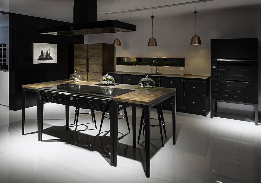 Интересное дополнение к кухонному острову – овальный стол черного цвета на оригинальном основании