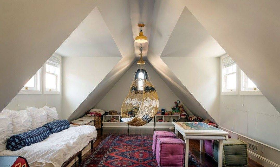 Например, к одной из стен можно зафиксировать небольшую перекладину. Если мансарда достаточно большая, то можно даже установить качели или горку. Важно размещать спортивные и игровые зоны максимально далеко от лестницы, так как это предотвратит падение ребенка