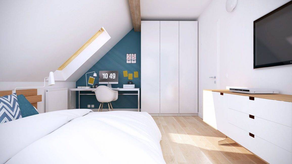 В оформлении помещений под крышей не используется много мебели. Но для спальни такое ограничение не является помехой. В этих комнатах не требуется много предметов. Стандартный корпусный шкаф в мансарде установить нельзя. Но по заказу мастера могут изготовить модели, которые установятся под наклонными стенами, обеспечат удобство, помогут создать оригинальный дизайн спальни в мансарде. Можно оборудовать отдельную гардеробную для размещения вещей.