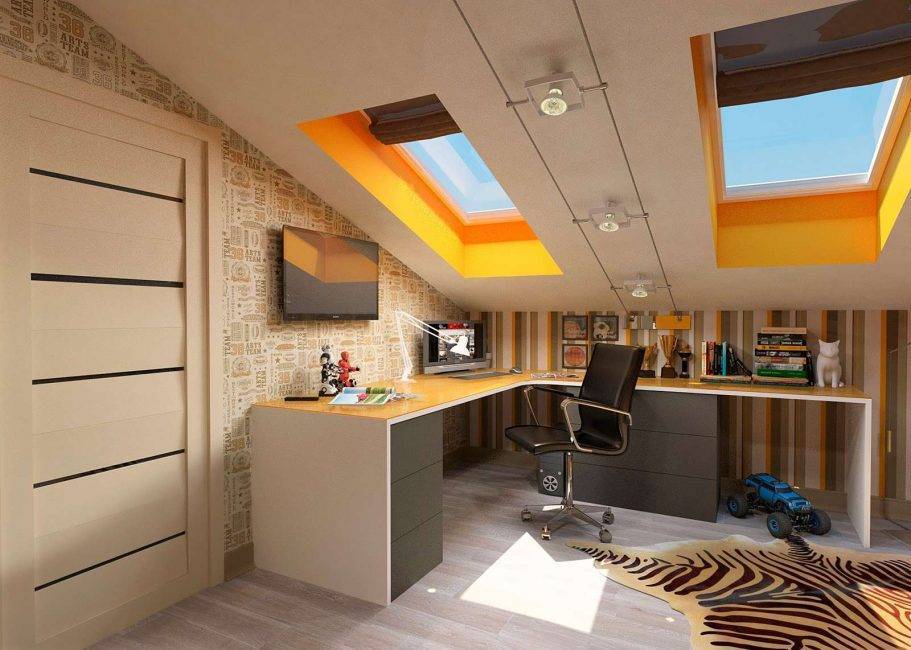 Письменный стол удобнее разместить возле окна: обилие естественного освещения поможет в подготовке уроков. Если окна мансарды выходят на солнечную сторону, можно ограничить свет рулонными или римскими шторами на специальном карнизе. Они крепятся на окна и снизу, и сверху.