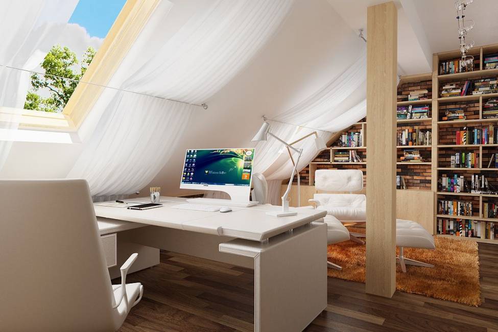 Еще одно интересное решение – кабинет на мансарде. Чердак отгорожен от «остального мира», а значит, здесь можно сосредоточиться на работе, обустроив стол с компьютером, мастерскую или библиотеку. Атмосфера здесь должна быть спокойной, для отделки лучше использовать натуральные или нейтральные оттенки, например, зеленый цвет активизирует мозговую деятельность. Рабочий стол лучше расположить у окна, дополнив пространство небольшим диванчиком и журнальным столиком для того, чтобы можно было немного расслабиться и отдохнуть.