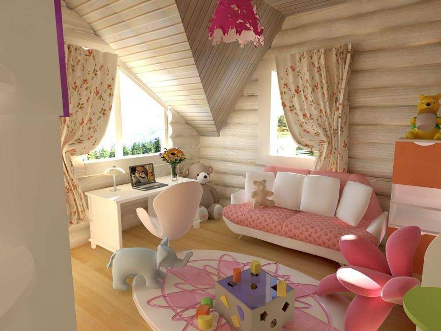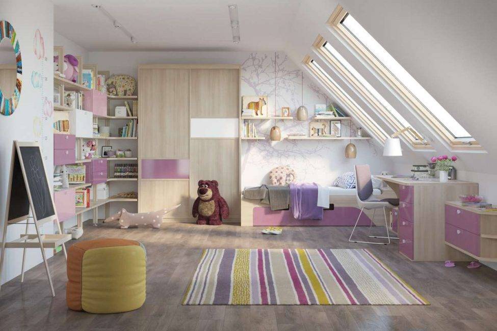 Выделить чердачное помещение можно и под детскую комнату, наполненную светом и яркими красками. Конечно же, для малышей такое помещение опасно из-за лестницы и скошенных потолков, а вот для детей, достигших школьного возраста, это отличный вариант. Ради безопасности ребенка выступающие балки лучше скрыть, вся мебель должна иметь эргономичный дизайн и закругленные углы. Обязательными элементами мебели являются: комод для одежды, кровать и рабочий стол. Что касается оформления, то лучше остановиться на пастельных тонах, которые можно разбавить яркими акцентами