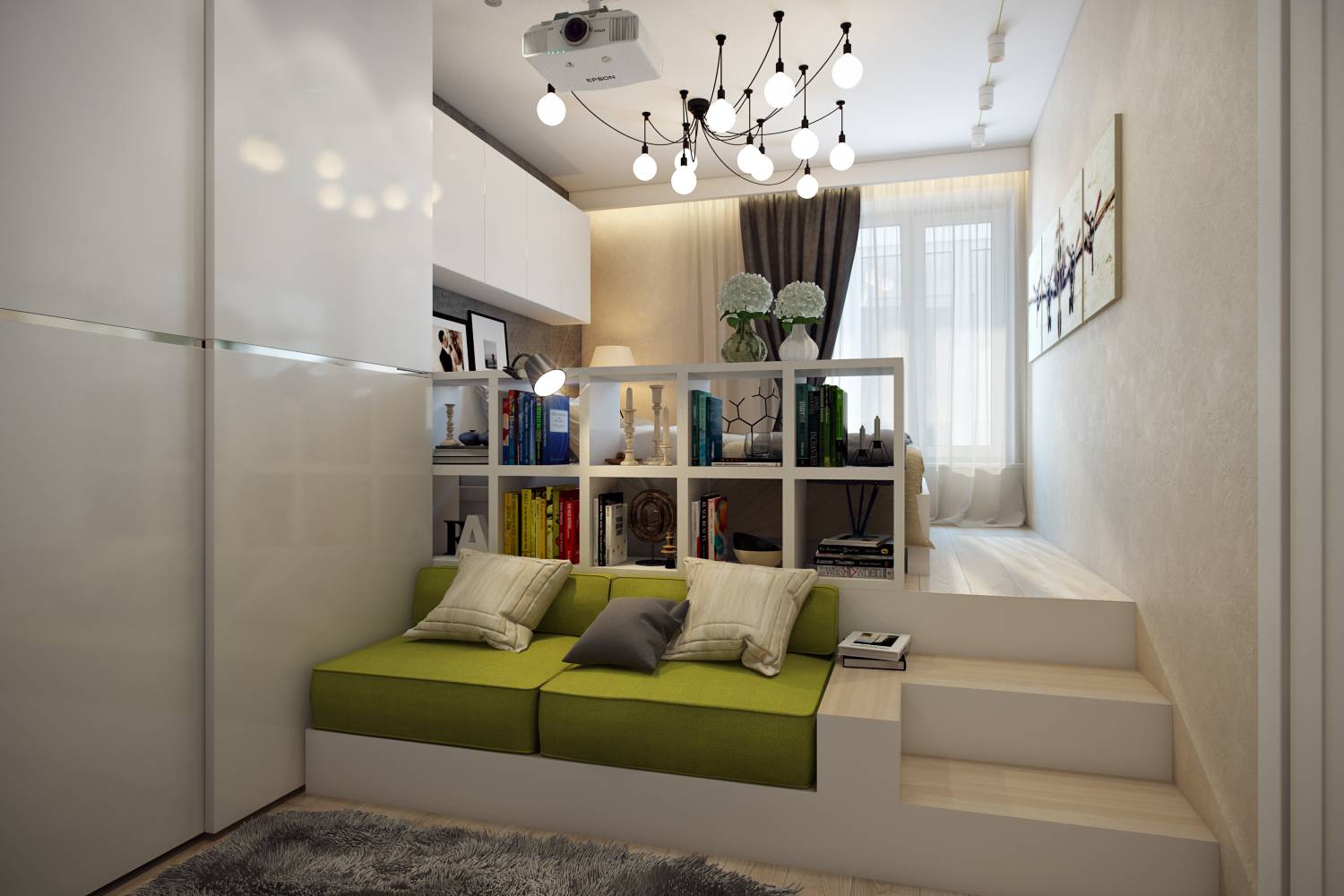 Еще один отличный, любимый дизайнерами прием для зонирования пространства — подиум. Под ним легко установить выкатную кровать или пару выдвижных ящиков, которые можно использовать для хранения постельных принадлежностей.