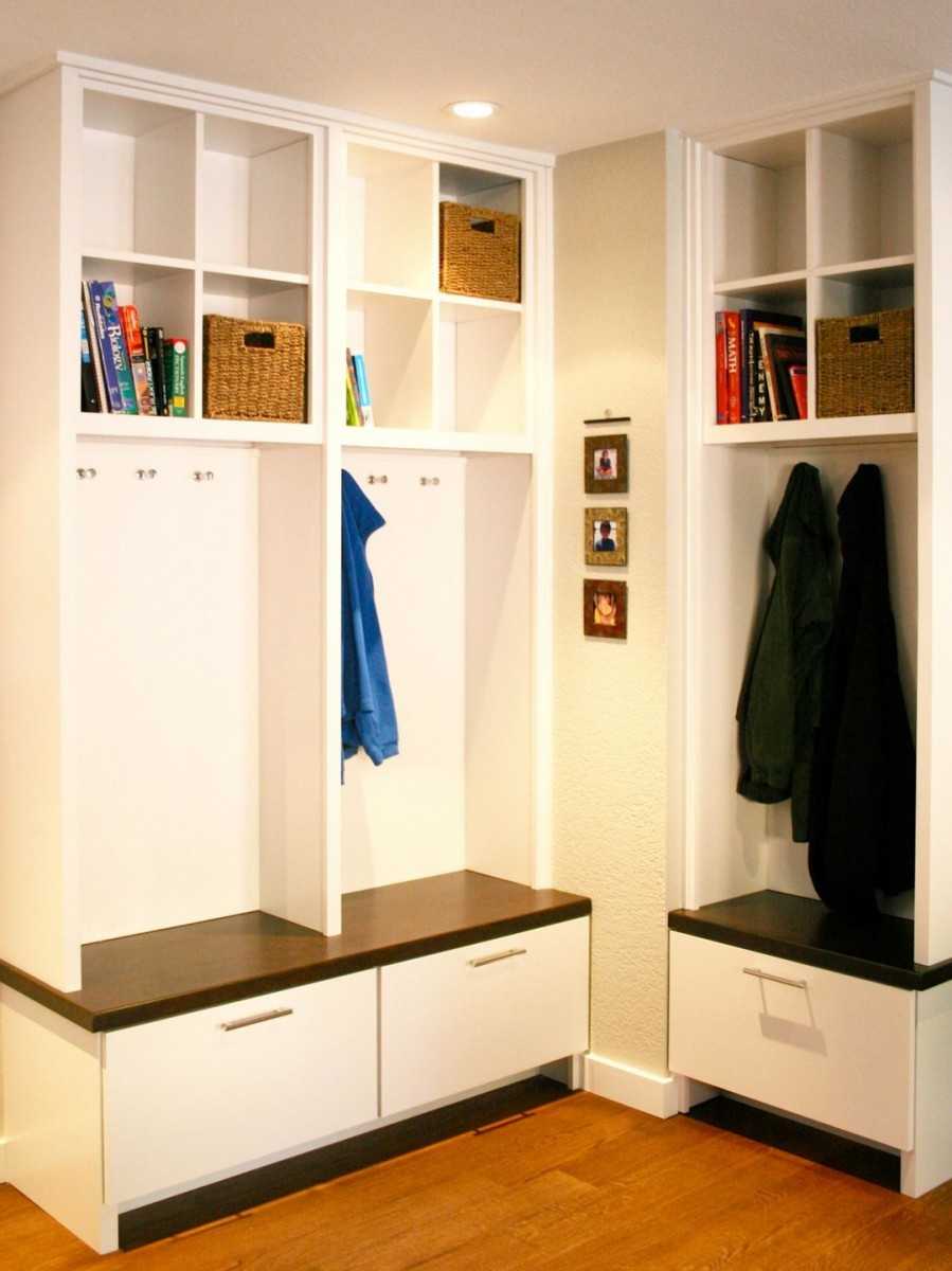 Трапециевидная планировка позволяет с одной стороны устанавливать прямоугольные опорные горизонтальные плоскости, а с другой стороны в углу приходится размещать треугольные полки или устраивать вешалку для одежды.