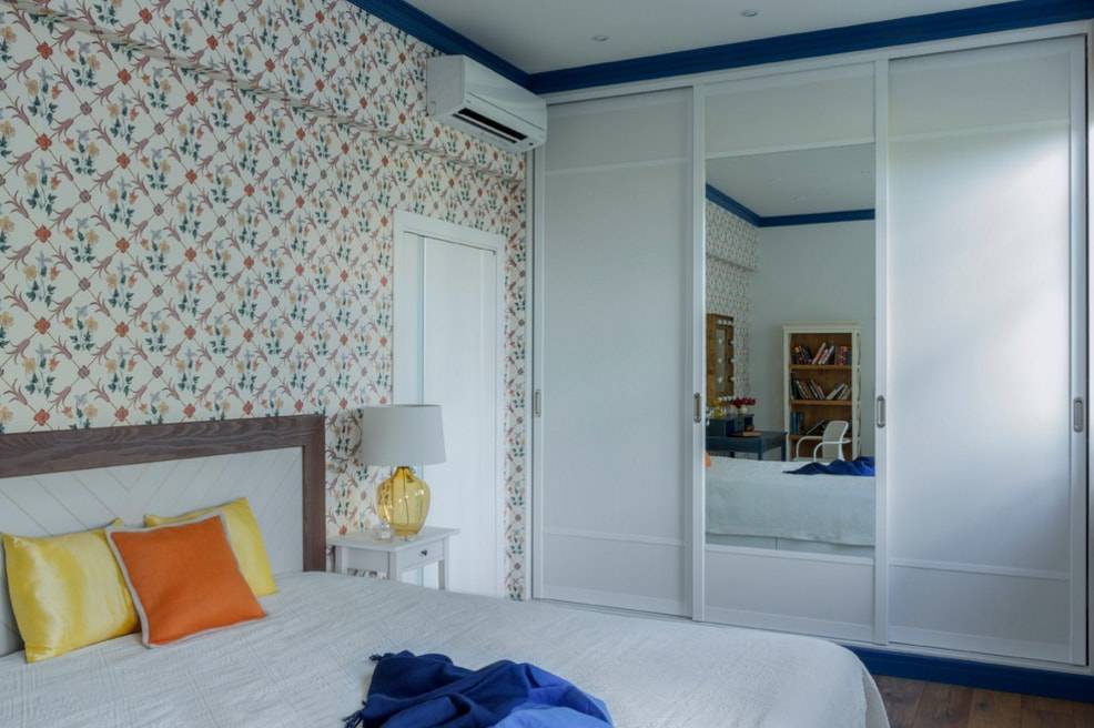 На фото шкаф-купе с зеркальными вставками в интерьере малогабаритного зала.