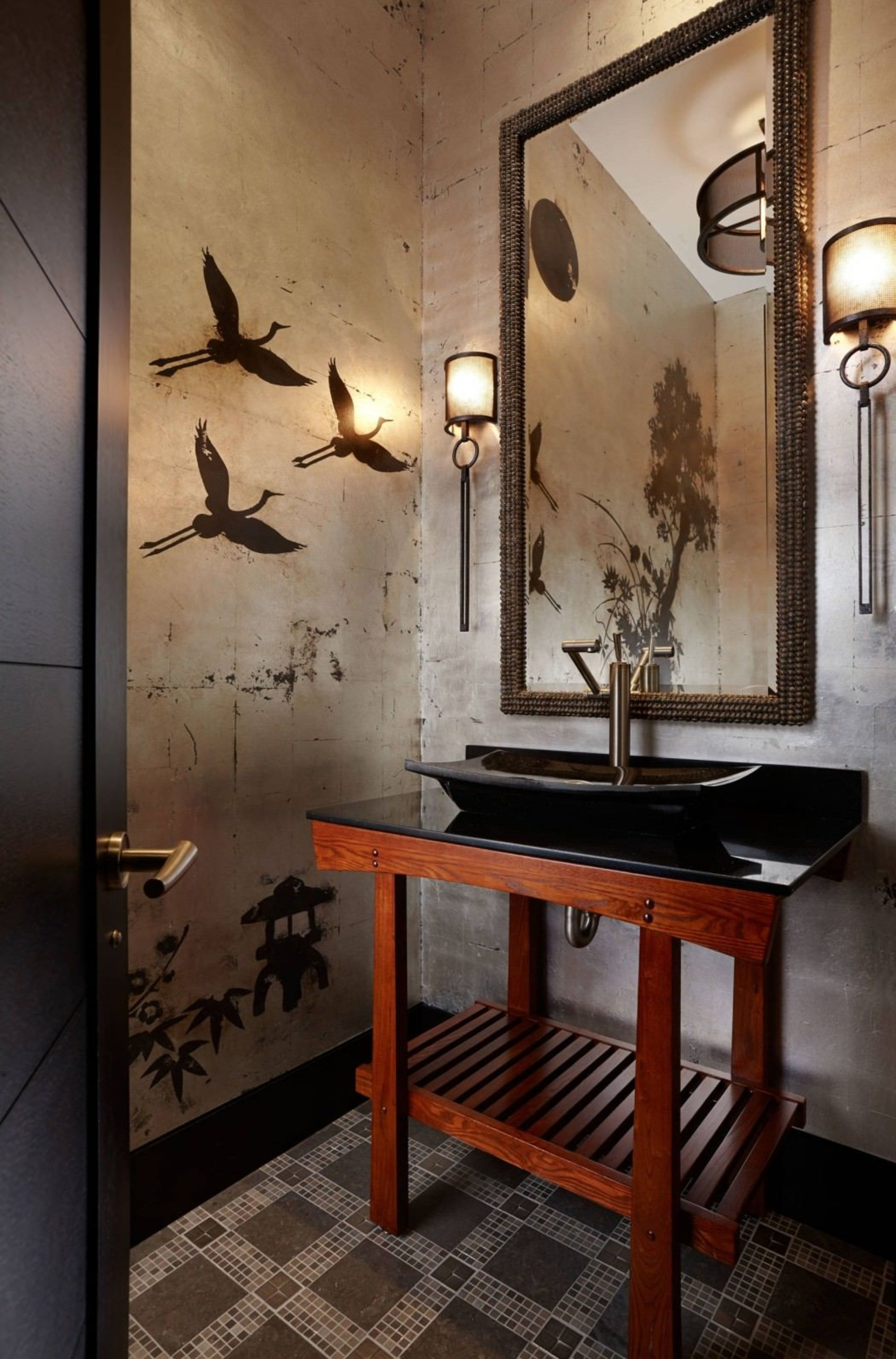 Более темные и фактурные полотна можно сочетать со светлыми, обыграв границы с помощью вставок из темной древесины, грубого декоративного камня или кирпича, металлических или зеркальных вставок.