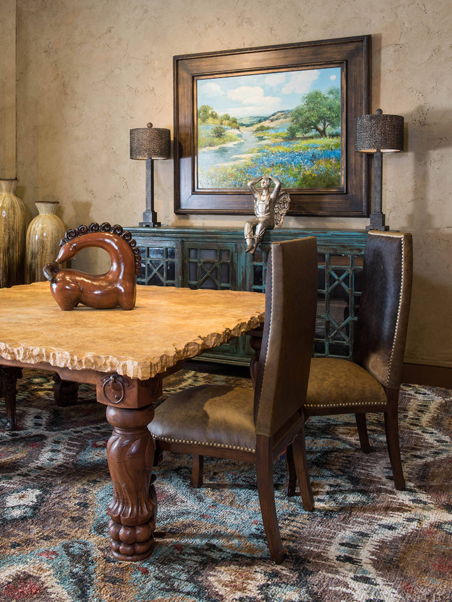 Очень уютная обеденная зона с деревянной мебелью и небольшим мягким уголком с обилием маленьких подушек в общей цветовой гамме