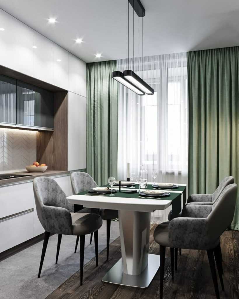 В этом году актуально сочетание длинных тканевых штор с технологичными роликовыми или римскими шторами. Это особенно хорошо смотрится в просторных кухнях, в которых присутствует и столовая зона.