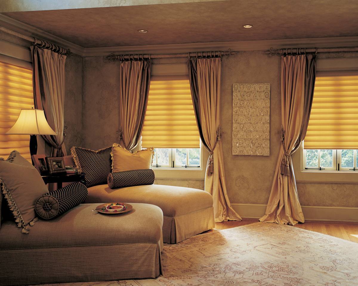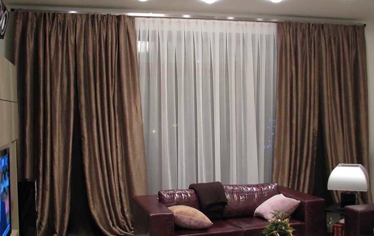 Насыщенные синие или коричневые тона также приветствуются в оформлении окон гостиной или спальни. Дизайнеры рекомендуют применять такие шторы в сдержанных, пастельных интерьерах с мебелью цвета дуба, сосны.