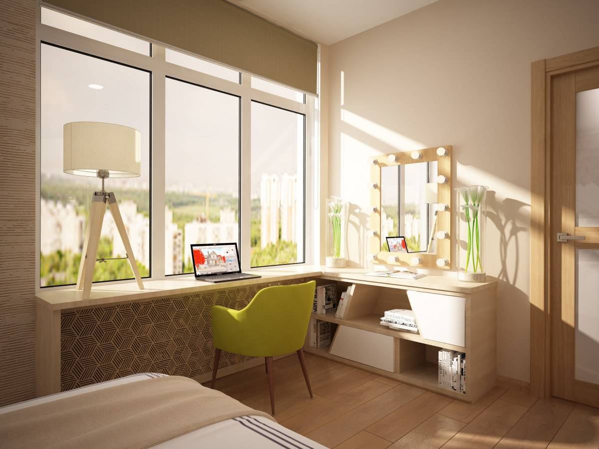 - Использование оконного проема выпуклой формы. Строгие линии подчеркнуты ламинированным профилем. Контрастная отделка удачно вписывается в оформление всей комнаты.