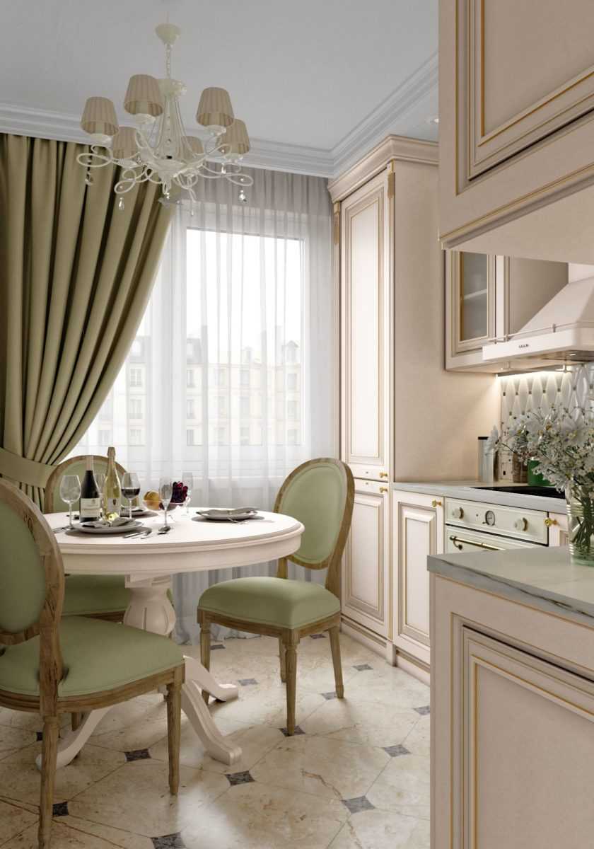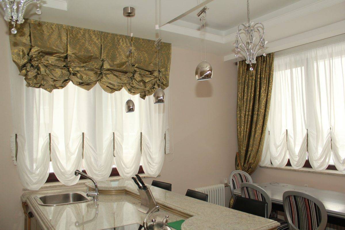 Кухонные окна оформляют короткими полотнами с драпировкой, позволяющими поднять их на нужную высоту. Выполняют их из легкой органзы.
