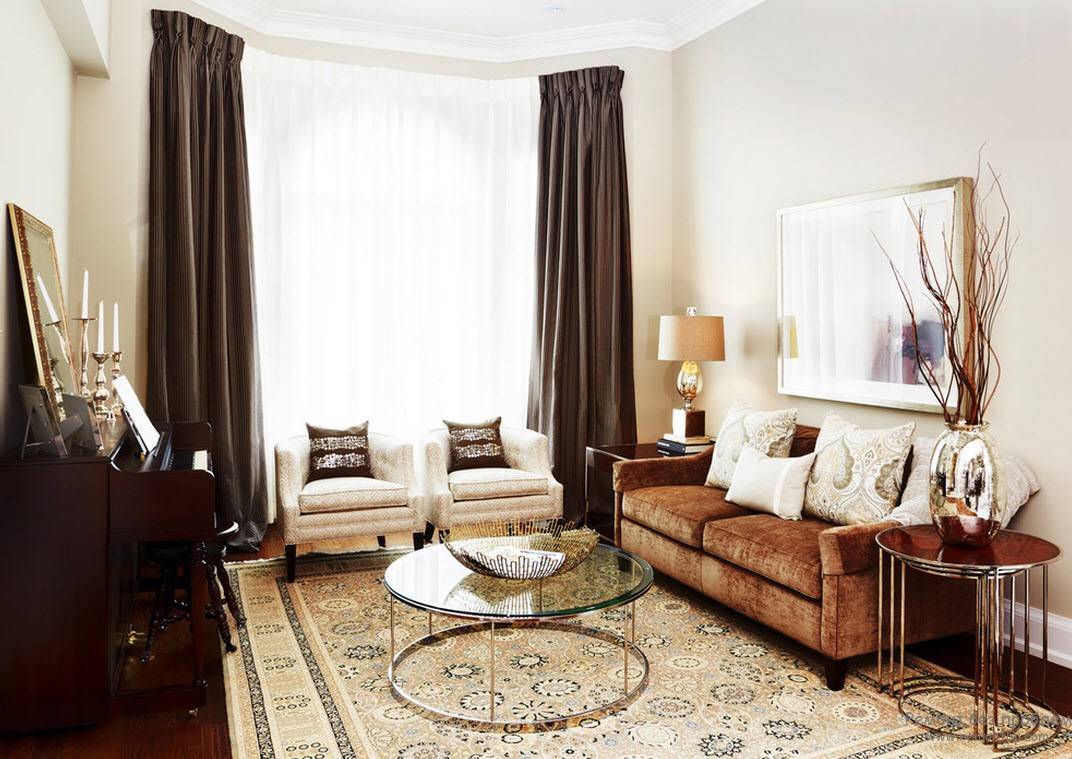 Такая схема удачно работает, когда мебельный гарнитур выполнен в нейтральных тонах. Чтобы привнести разнообразие в интерьер, его можно разбавить интересным рисунком на шторах и напольном ковре. Декор интерьера также выиграет, если подобное изображение будет и на аксессуарах. Если же мебель характеризуется яркостью своей обивки, то вышеупомянутую пару рекомендуется отодвинуть на второй план. Сделать сочетание фоновым. При этом у них может быть схожим не только цвет, но и текстура материала.