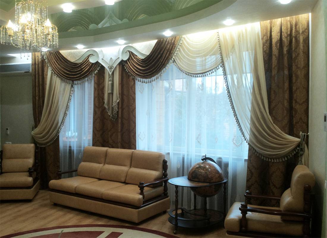 Этот дизайн оконного оформления отличается пышностью и нарядностью, что подойдет не для каждого интерьера. В современных минималистских интерьерах такие шторы будут смотреться вычурно и смешно. Назначение их – подчеркнуть роскошь убранства, достаток и богатство.