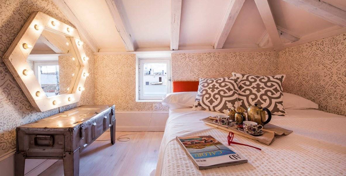 Одновременно старинный и современный стиль. Подходит для узких спален с окнами и без. Характерная черта — наличие кирпичной стены. Если такой эффект организовать невозможно, выполняют имитацию. Ее создают с помощью кусочков пенопласта или специальных пластиковых панелей.