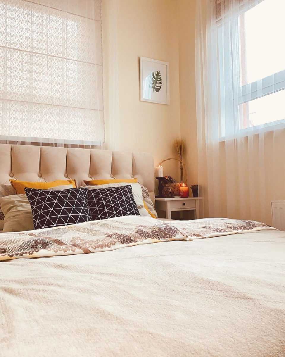 Еще один вариант дизайна спальни в 9 кв. м. – все в светлых тонах. Бежевый, молочный, персиковый в сочетании с белым сделает вашу комнату образцом нежности и стиля. Такие комбинации часто использовались в королевской приемной, делая ее светлой и величественной.