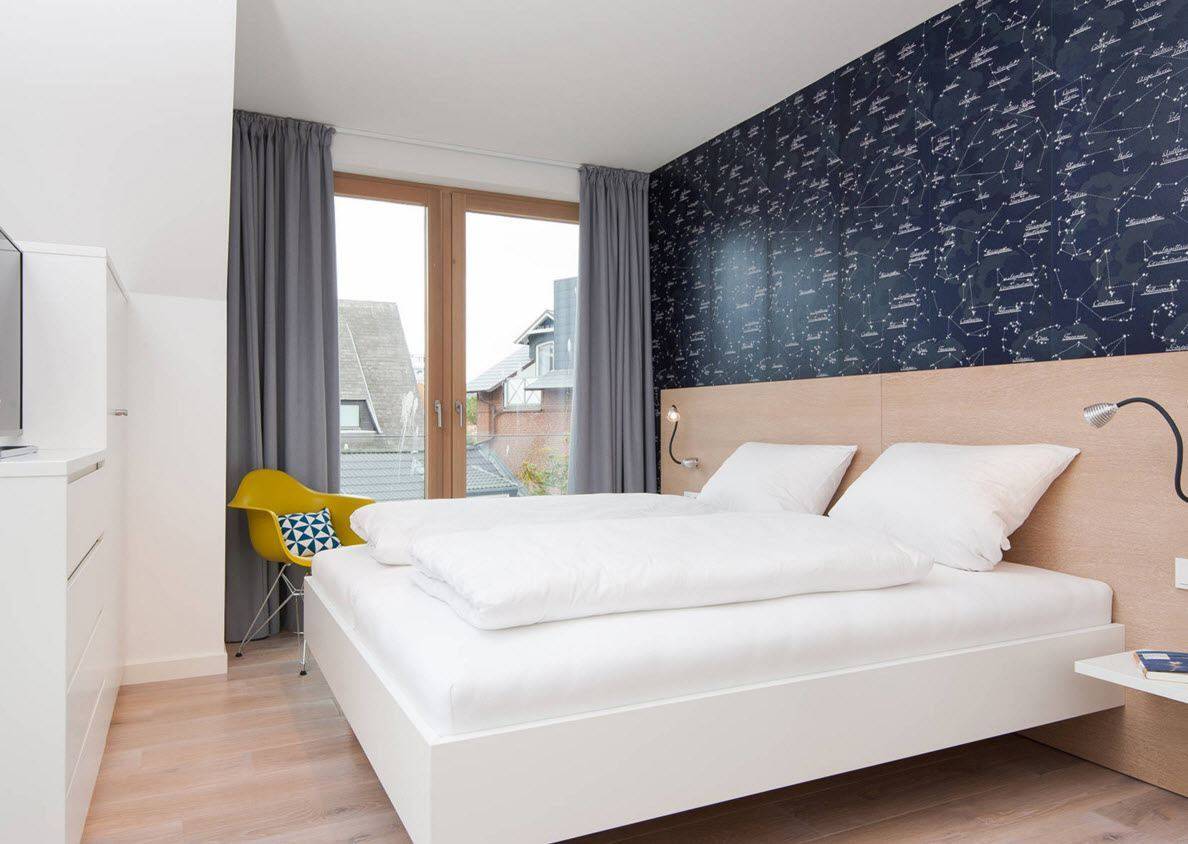 Применение контрастного цвета для оформления акцентной стены также благоприятно скажется на составлении образа спальни.