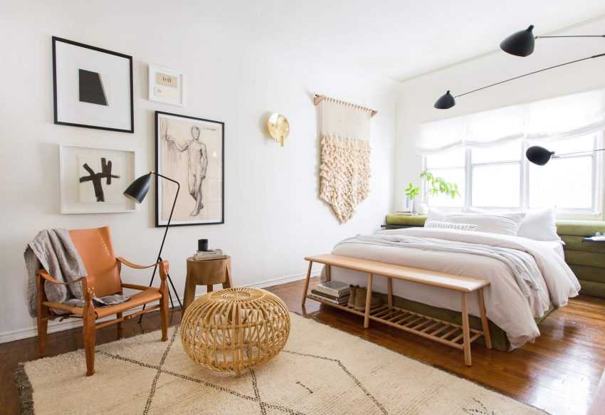 В таком стиле интерьера предпочтительнее использовать светлые тона и акцентировать внимание на спальном месте. Для этого используют декорирование подушками, накидками и покрывалами