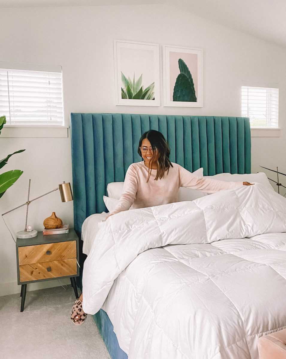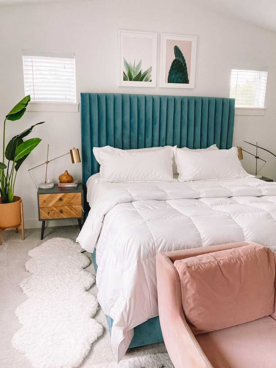 Небольшая спальня с зелеными акцентами.