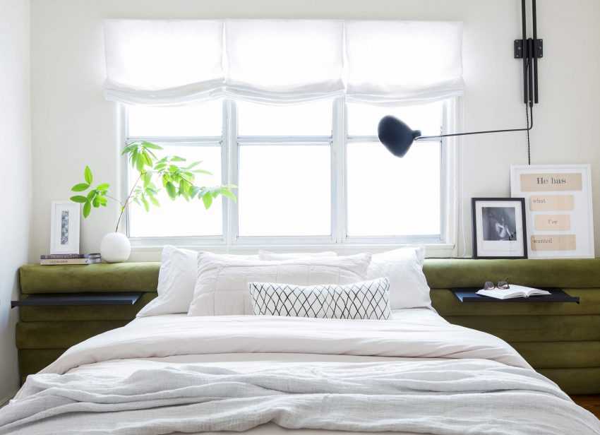Лучше пожертвовать размерами прикроватных тумбочек и заменить их компактными столиками-подставками, чем придвигать кровать в угол.