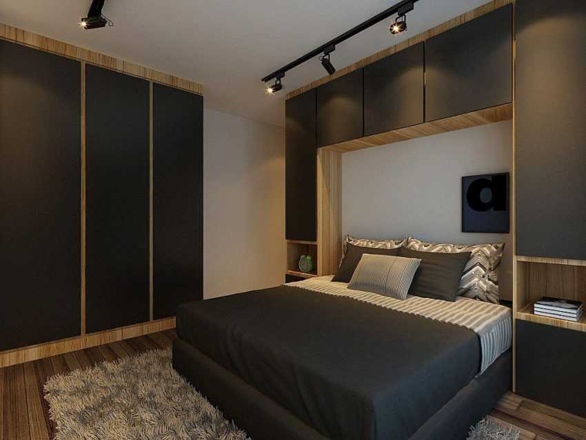 Небольшая спальня в стиле минимализм подразумевает размещение функциональной мебели. Допускается совмещение зеркал, выезжающих створок и шкафчиков. Рекомендуют в дизайн узкой спальни встраивать полки, тумбочки и ящики. Все эти детали должны быть выдержаны в едином оттенке. Фурнитура каждого из предметов должна соответствовать интерьерному решению: никаких вычурных деталей, фигурных ручек.