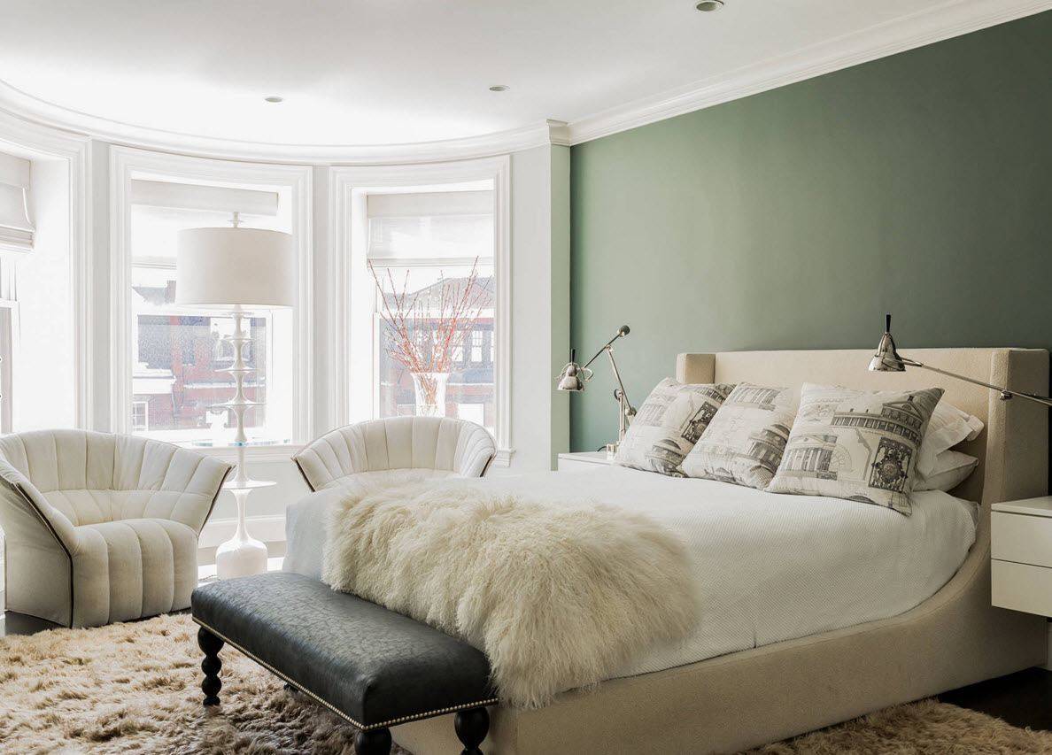 Универсальным вариантом является белый. Он может существовать как в одиночку, так и в комбинации с другими цветами. Конечно, лучше его использовать в тандеме, чтобы из спальни не получилась больничная палата. В современном интерьере часто используется способ контрастного выделения. Так, вы окрашиваете все поверхности спальни в белый цвет, и делаете, контрастную стену. Например, отделываете стену над кроватью ярким красным кирпичом. Акценты можно делать и на ярком постельном белье, занавесках или напольном покрытии.