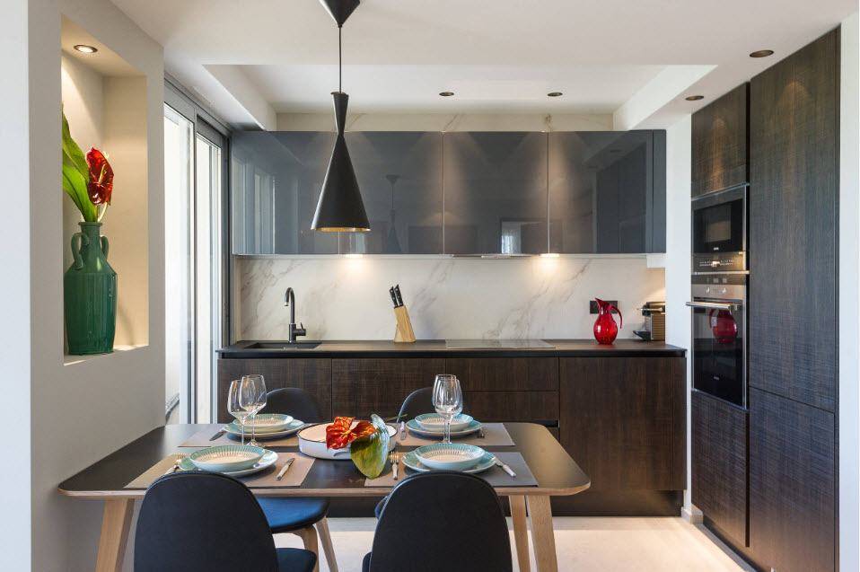 Все, однако, зависит от того, какая комната у вас есть. Если имеете дело с пропорциональной и большой территорией, то проблем не будет. У вас много возможностей для маневра, и результат зависит только от личных предпочтений, какой кухонный гарнитур выбрать. Если у вас маленькая кухня, узкая и длинная, то лучше всего разместить мебель и технику вдоль одной стены. Хотя многие люди боятся такого решения, этот страх возникает только из-за неумелого расположения шкафов, полок и оборудования. Тщательно продуманное размещение всех этих элементов сделает прямую кухню очень комфортной для пользователей.