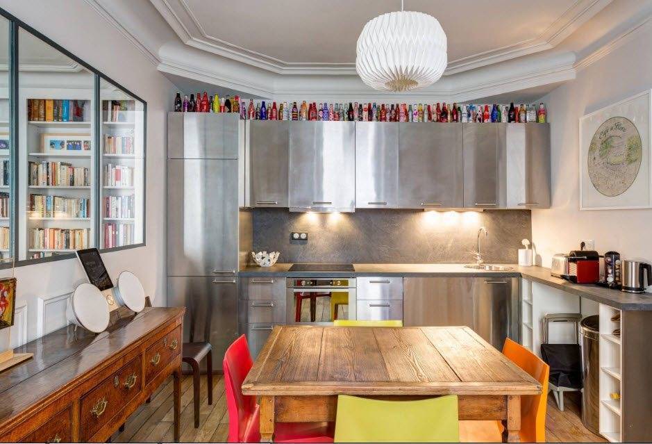 - Максимальное использование металла. Ножки столов и стульев, металлические короба мебели, выкрашенные в различные цвета, вот что становится действительно стильным.