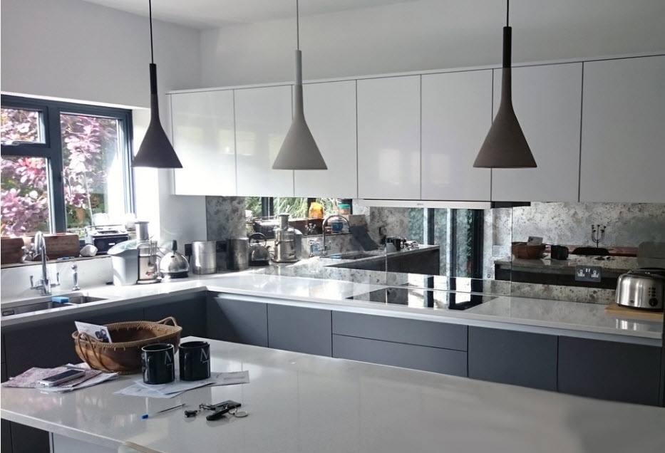 «Зеркальный фартук на кухню должен размещаться между верхним и нижним ярусами мебели, при этом он должен выглядеть, как единая композиция»
