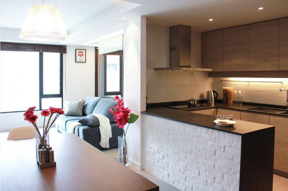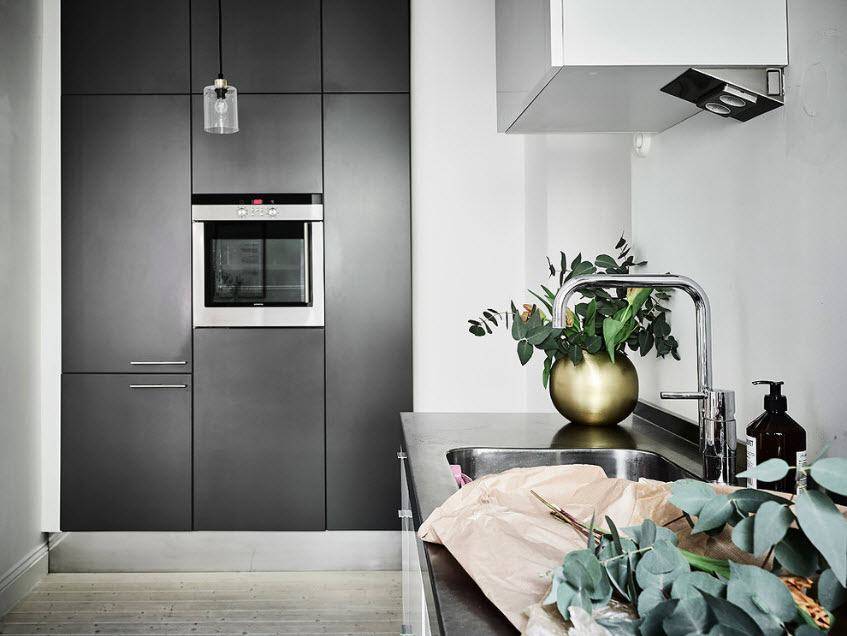 Прямая кухня вовсе не компромисс только для небольших интерьеров. Это, прежде всего, отличный вариант на объединение кухни с гостиной. Шкафы и выдвижные ящики, встроенные в одну стену, выполняют функцию комода. Гарнитур также имеет удобную рабочую столешницу для приготовления. Популярным и модным решением является также сочетание однорядного кухонного уголка с вместительным островом, на который можно переместить рабочее пространство, а всю стену застроить шкафами и бытовой техникой. Тогда нужно помнить, что стиль кухни должен хорошо сочетаться с дизайном гостиной.