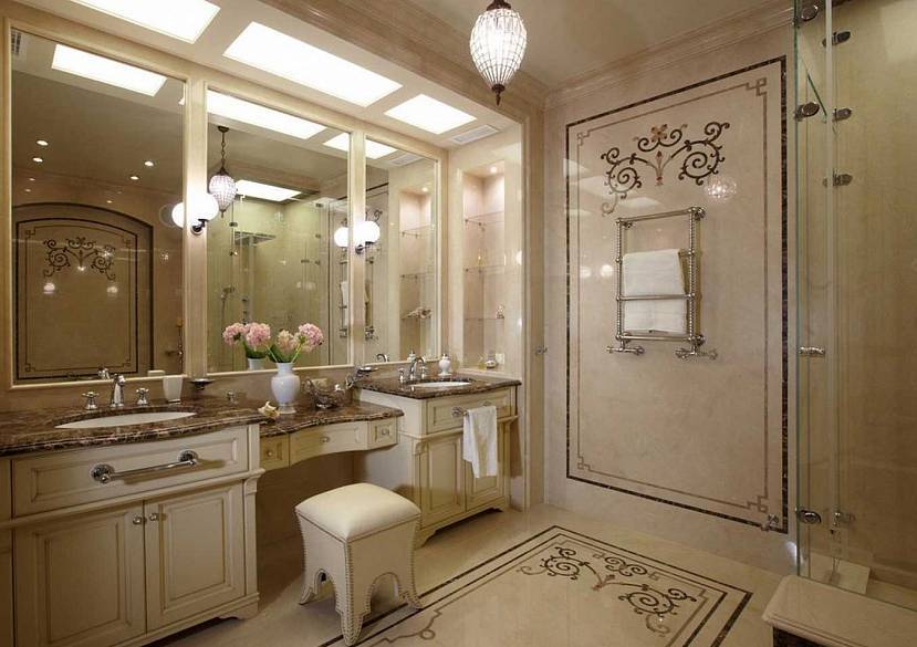 Все-таки неоклассика многое взяла из дворцовых интерьеров, поэтому ей близки просторные помещения, полные воздуха и света. В идеале ванная комната в стиле неоклассика должна быть просторной, может быть, даже объединенной со спальней или отделенной стеклянными перегородками. Чем больше места и свободы в передвижении, тем лучше.