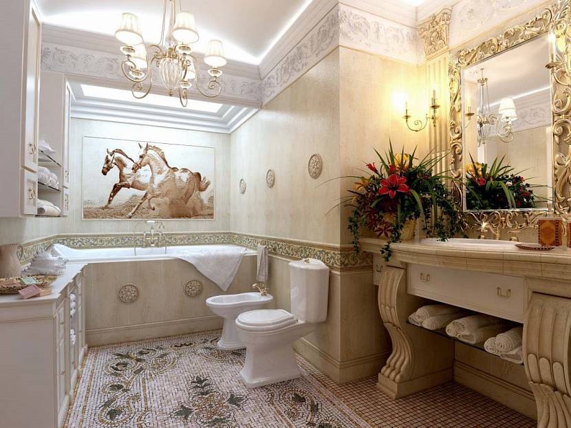 Дизайн ванной в классическом стиле предполагает использование качественной сантехники. Чтобы интерьер был целостным, все предметы интерьера должны соответствовать друг другу по форме, оттенку.