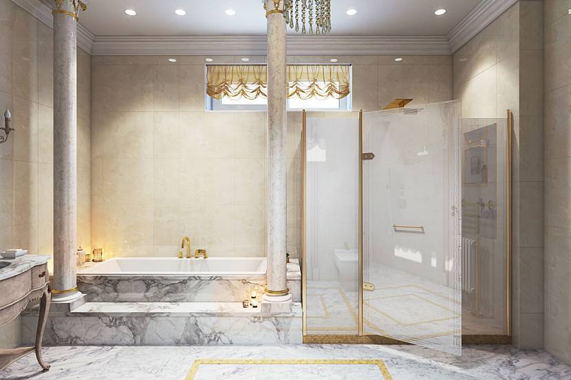 Идеальным вариантом душевой в классическом помещении станет одна перегородка из стекла с мраморной отделкой стен.