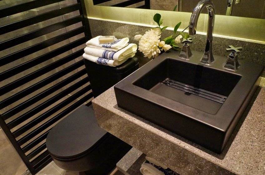 - Материалы для отделки, наряду с оборудованием, должны выбираться в соответствии с выбранным стилем. Для классического интерьера подойдет натуральный камень, лепнина, смесители, имитирующие благородный метал, зеркала. Для минимализма потребуется наличие стекла, плитки светлых оттенков, панели из пластика;