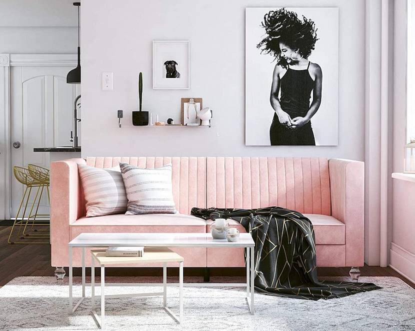 Использовать пудровый для всего помещения не обязательно. С его помощью можно освежить декор, сделав его более легким и при этом не нарушить строгость оформления. К примеру, используя его в стиле лофт, получится сделать элегантные акценты на строгом сером фоне. Пастельными могут быть мебель, аксессуары (статуэтки, декоративные подушки, светильники).