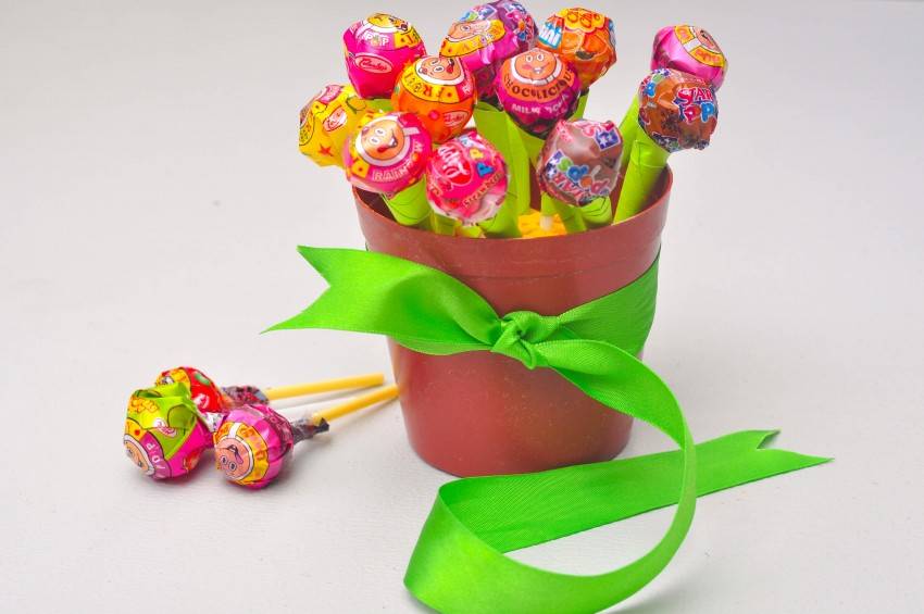 Все элементы прикрепляются к плошке клеем. В качестве дополнительного декора подойдут ленты, банты, кружево, косички из пряжи, пуговицы, тканевые цветы и т. д.