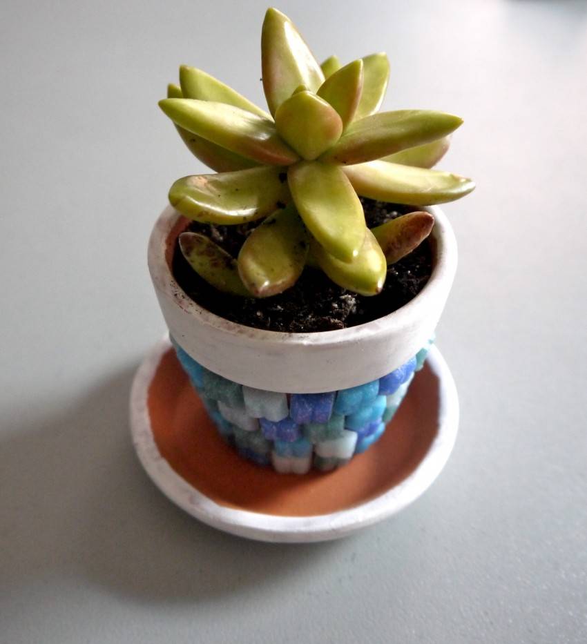 Подходит как для маленьких плошек, так и для громоздких садовых вазонов. В качестве мозаичных элементов можно использовать осколки битой посуды или зеркала, цветные стёкла, небольшие камушки и т. д.