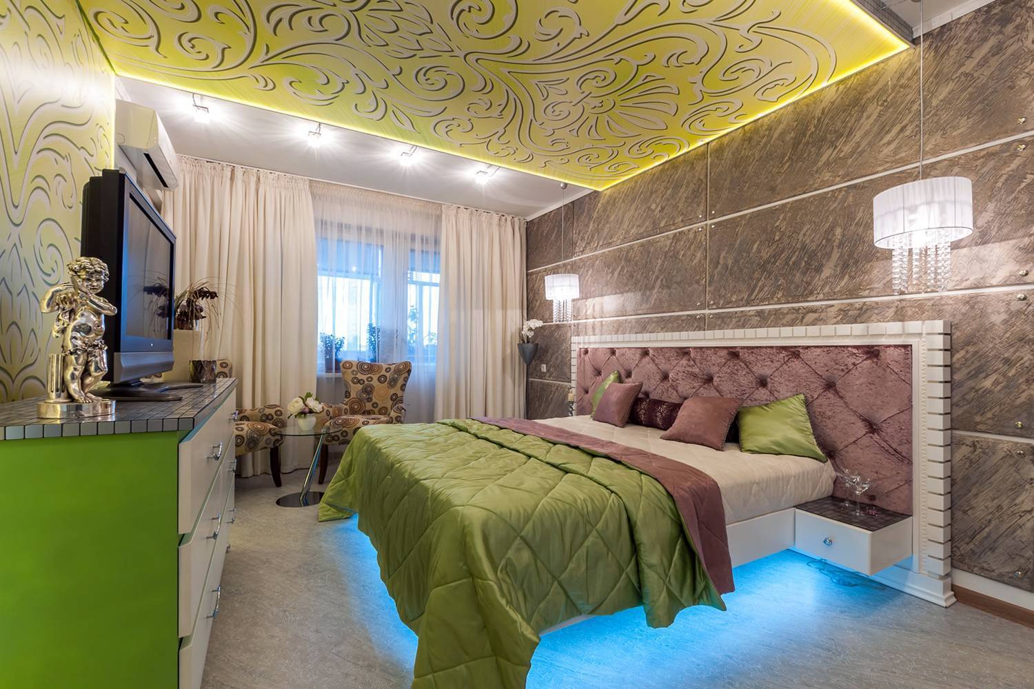 Спальня с разными видами освещения