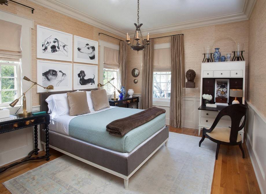 Атмосфера, создаваемая тканевой отделкой, заслуживает отдельного внимания. В дизайне классической спальни используются ткани с вышивкой, набивкой и разнообразными узорами, в тандеме с ними часто используют строгие и лаконичные расцветки, иногда однотонные полотна.