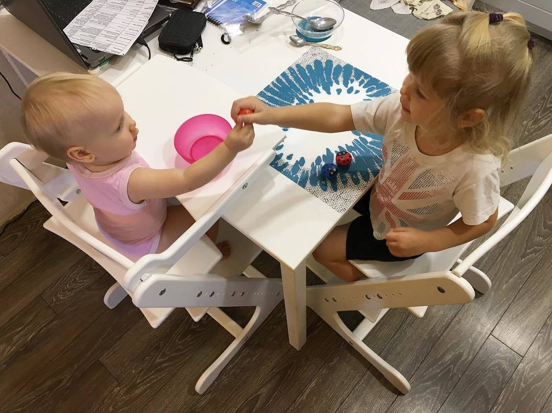 Ребенку уже в год можно показать как здорово сидеть на своем рабочем месте и делать вместе с мамой разные поделки и рисовать рисунки. Детям нравится, что их допускают ко взрослому столу, они начинают повторять взрослые действия и быстрее учатся выполнять их правильно. Чтобы ребенок сидел с вами за обеденным столом, ему нужно приобрести детский высокий стульчик, который будет удобен ребенку и соответствовать размеру стола.