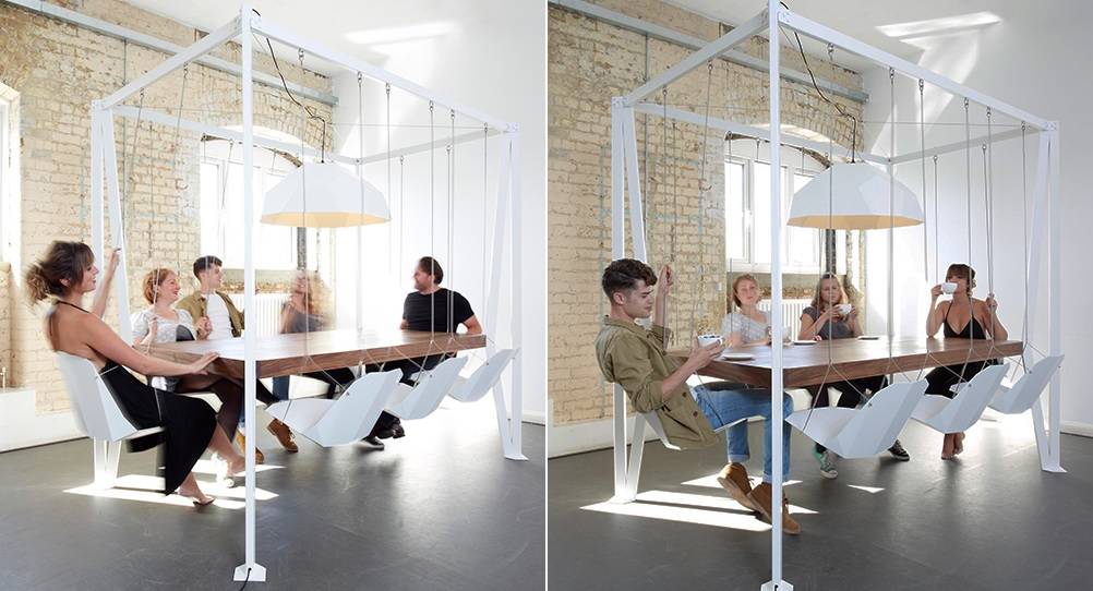 Вы с детства обожали качаться на качелях? Вы человек, который любит всё необычное? Толстая деревянная столешница, раскреплённая на надёжной металлической конструкции и восемь кресел, подвешенных подобно качелям – Замечательное воплощение вашей детской мечты.