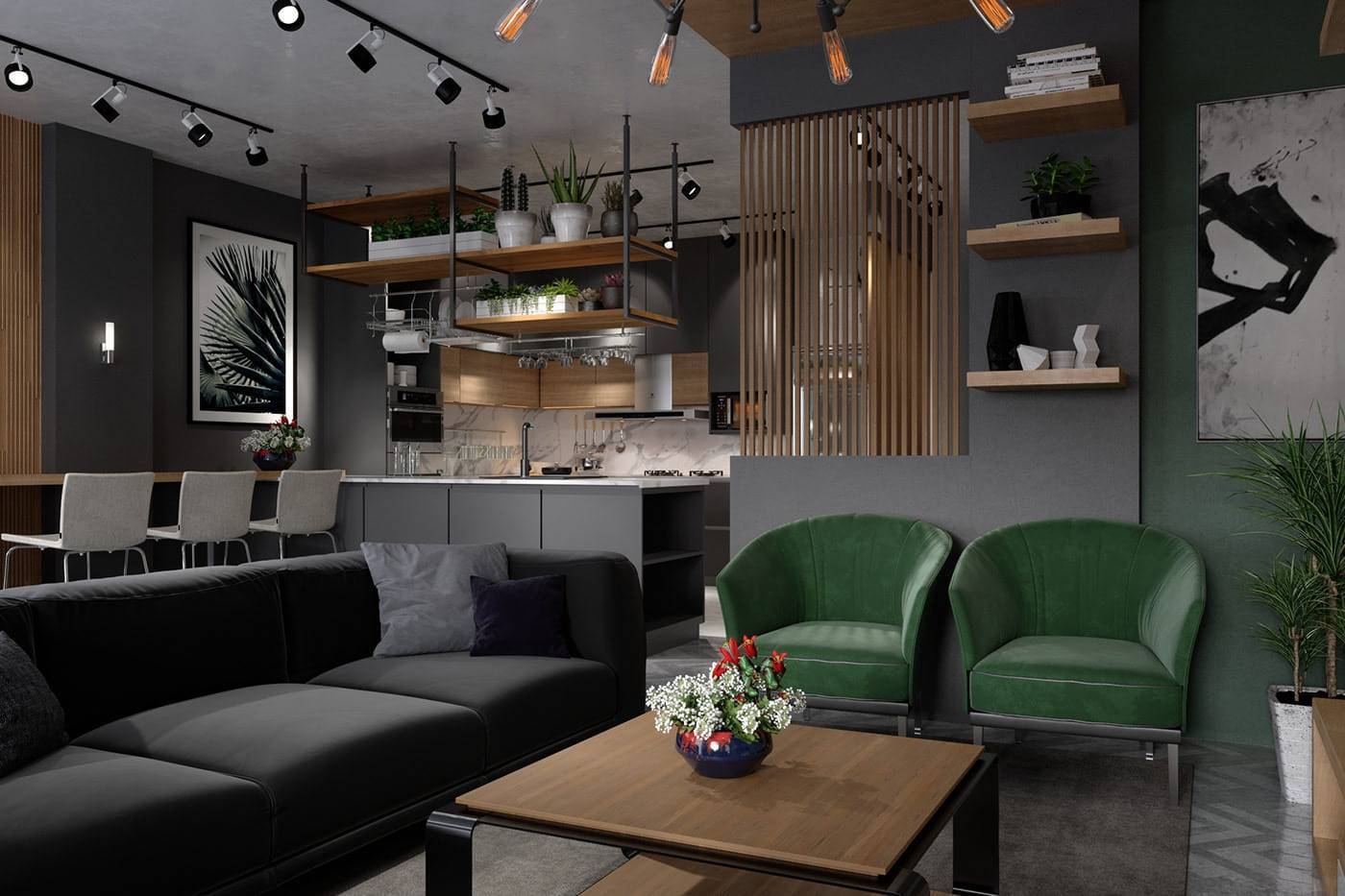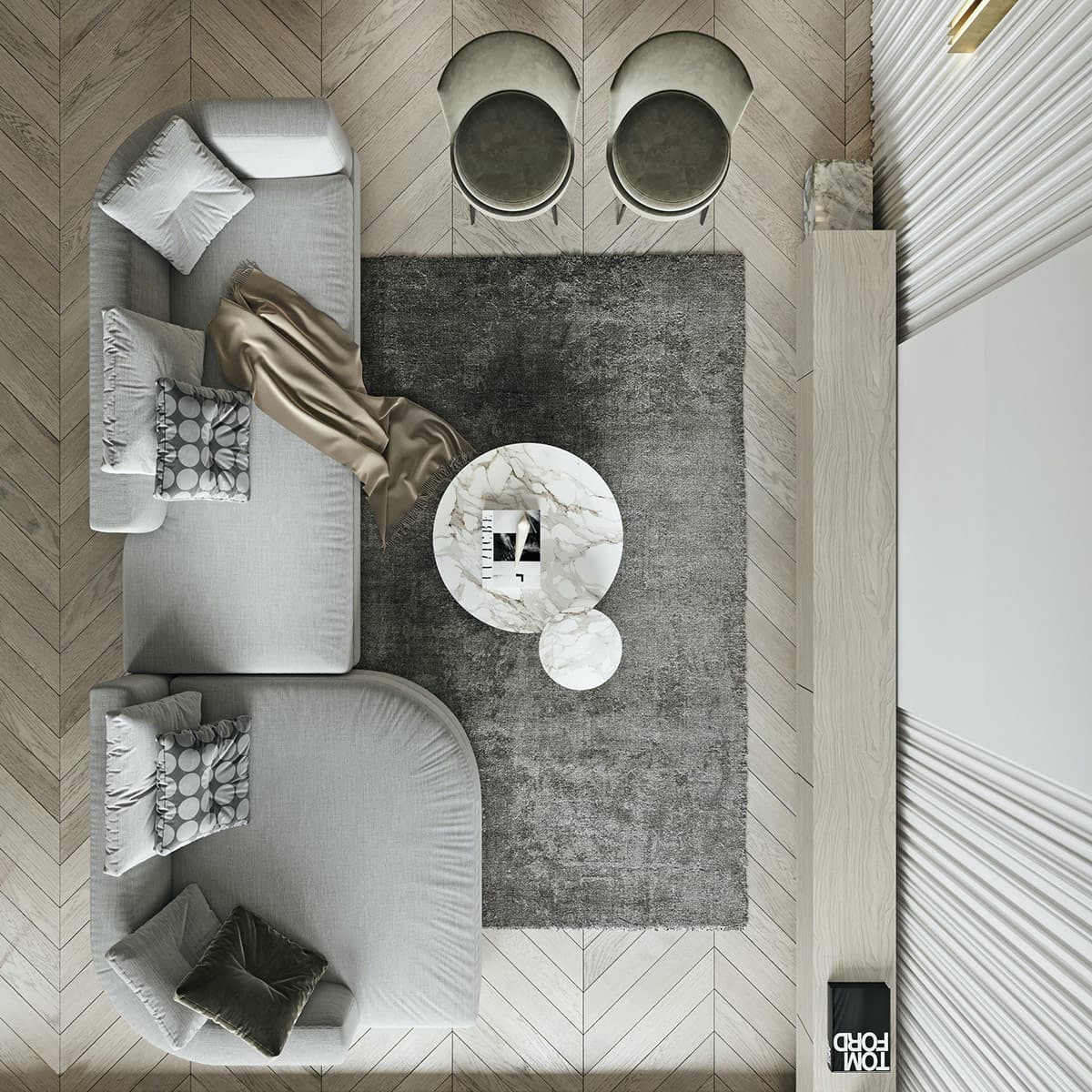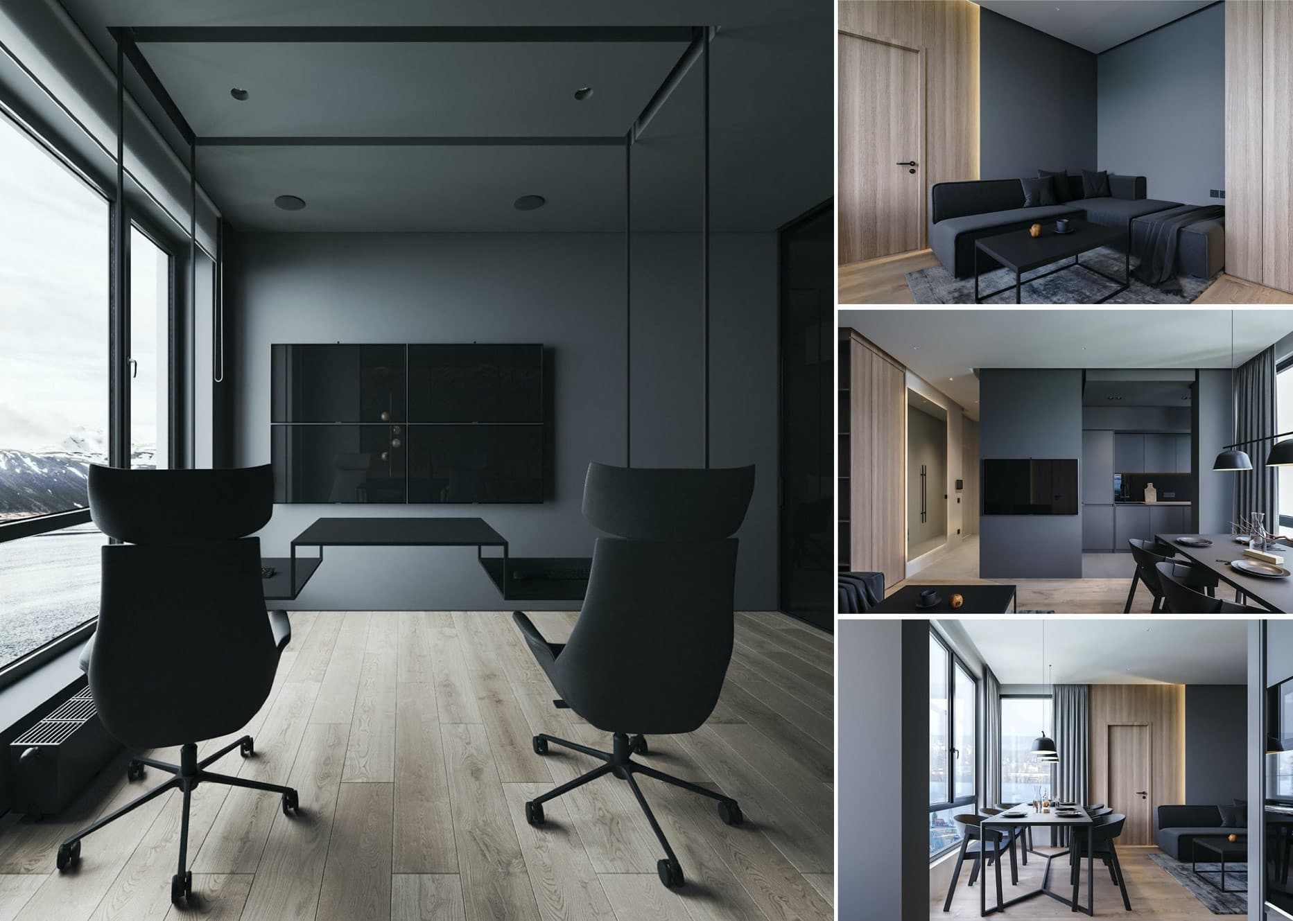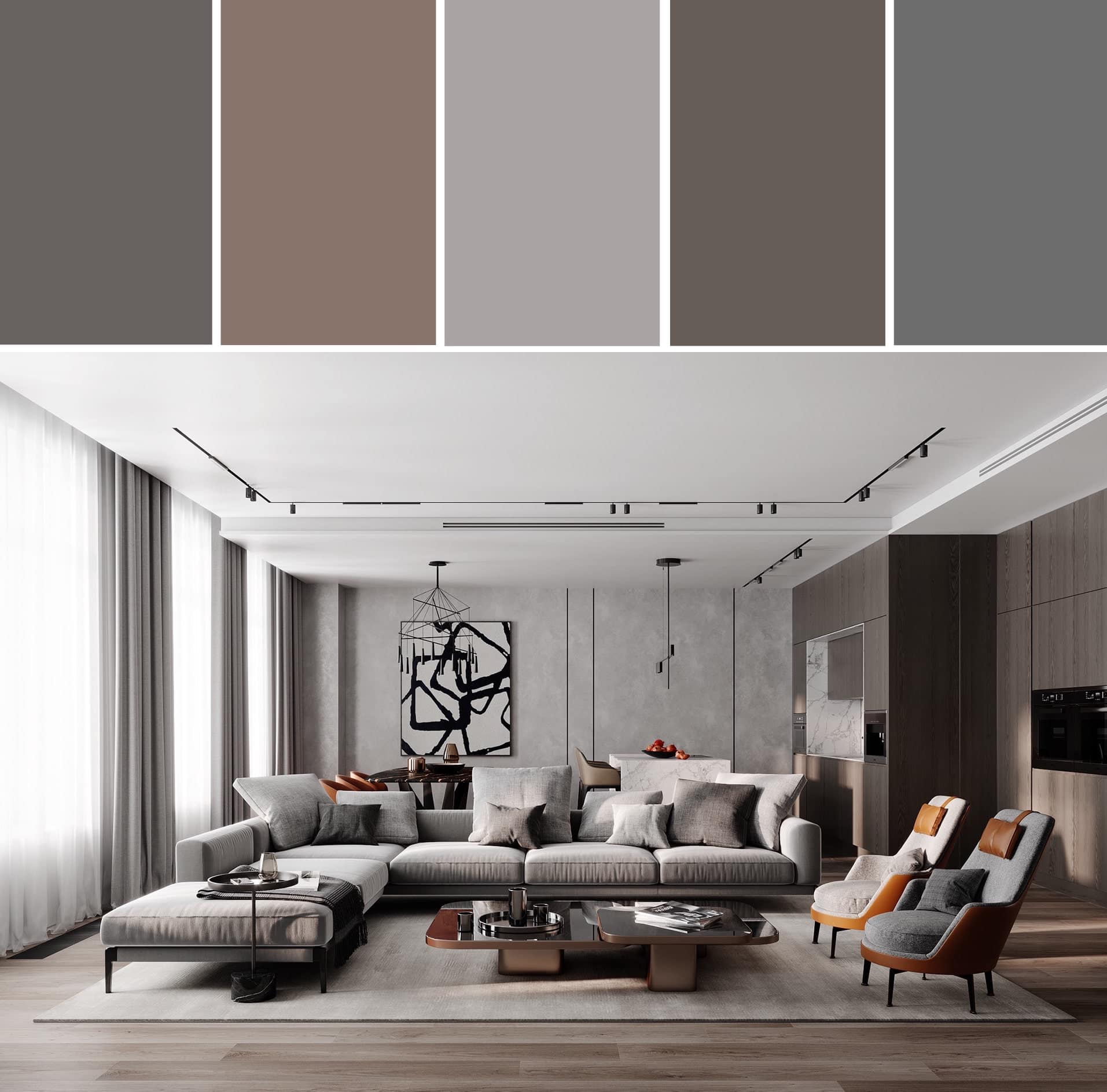 Зал в теплых серых тонах смотрится по-настоящему роскошно и благородно, а гостиная оформленная в прохладных стальных цветах, может вызывать ассоциации с заводским помещением.