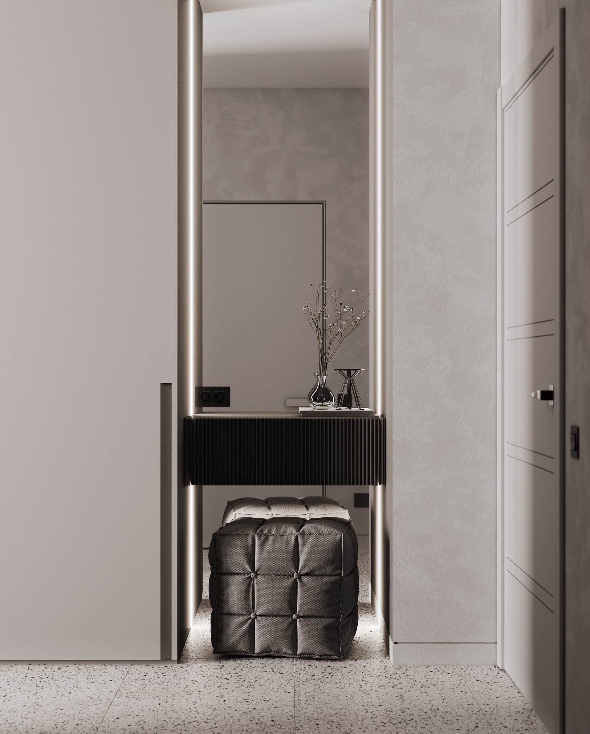 Современная прихожая в сером цвете с большими зеркаламиИсточник design-homes.ru