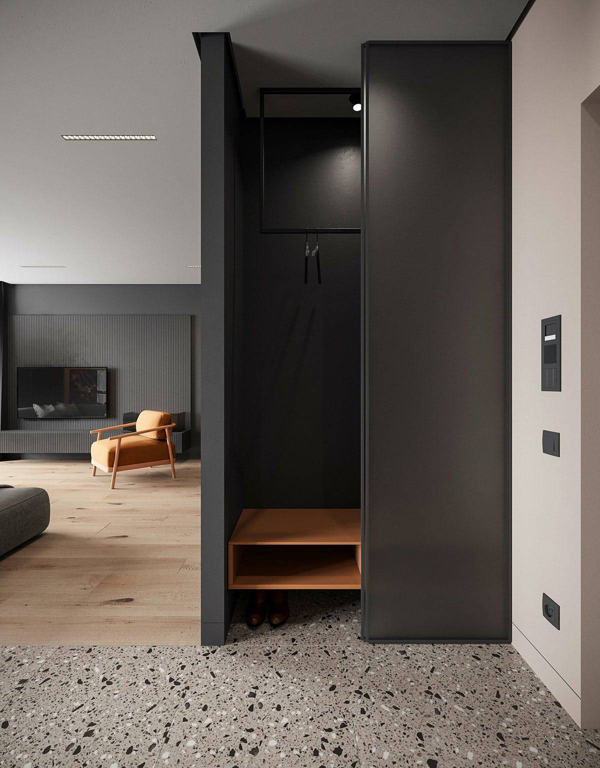 Черный в сочетании с серебряным в стильном решении оформления коридораИсточник vatikam.com