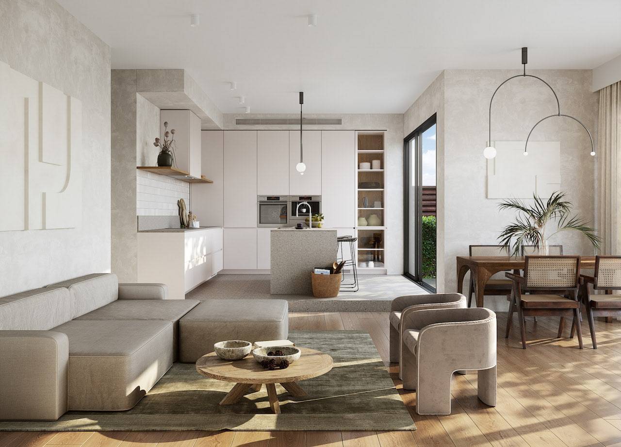Натуральный оттенок и модные предметы, элементы интерьера дают гармоничное соединение природы и современности. Такой прием гарантирует расслабление и ощущение гармонии.