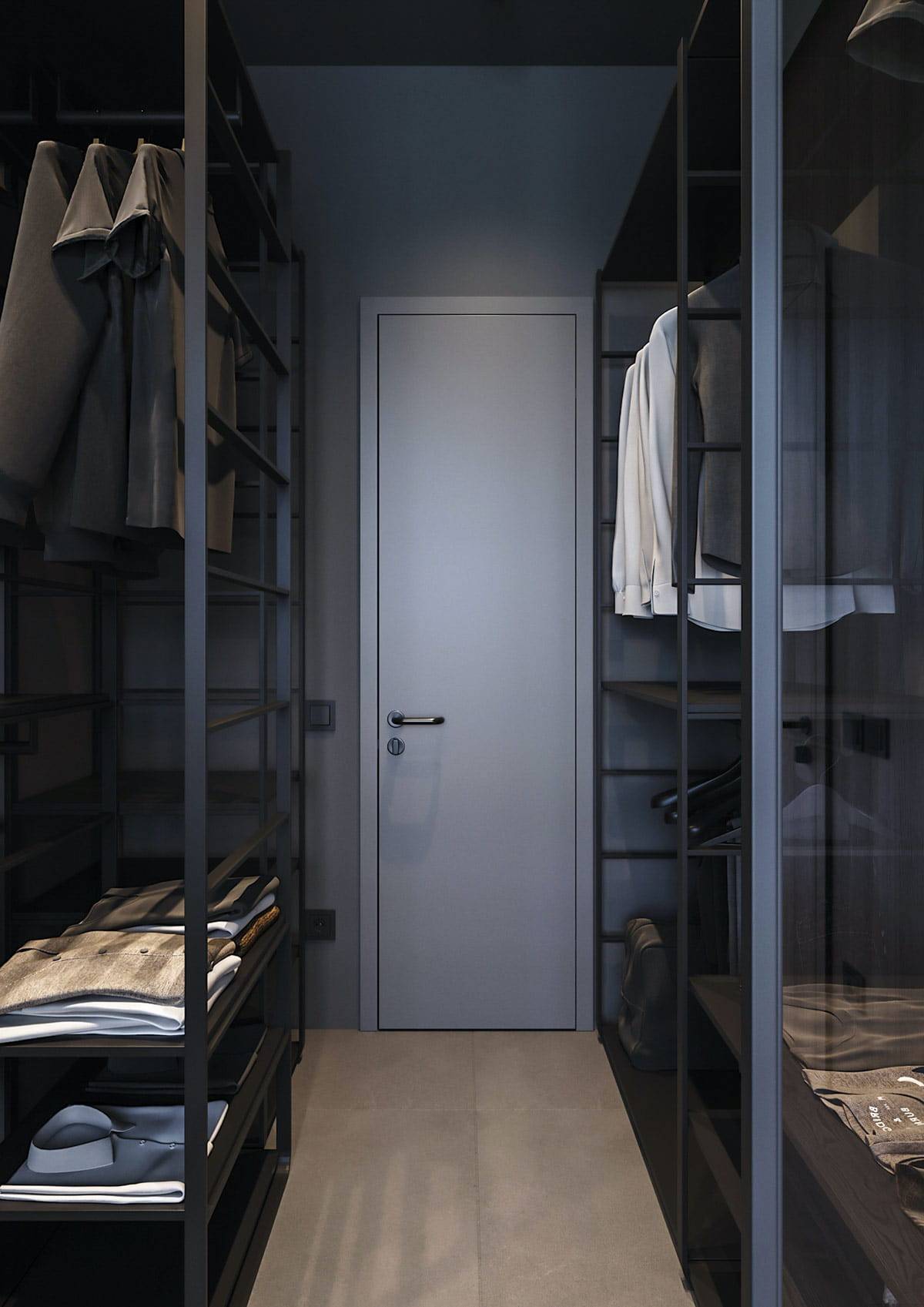 На фото двери в светло-серых тонах в интерьере просторной спальной комнаты.