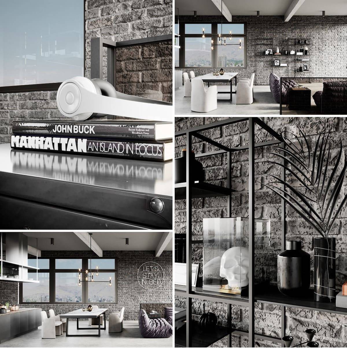 В индустриальной стилистике серая гамма занимает большую часть пространства. Ахроматические оттенки встречаются в бетонных стенах, дешевой силикатной кирпичной кладке, плитке кабанчик, металлических трубах и других коммуникациях. Благодаря огромным оконным проемам такая обстановка смотрится свободно и просторно.