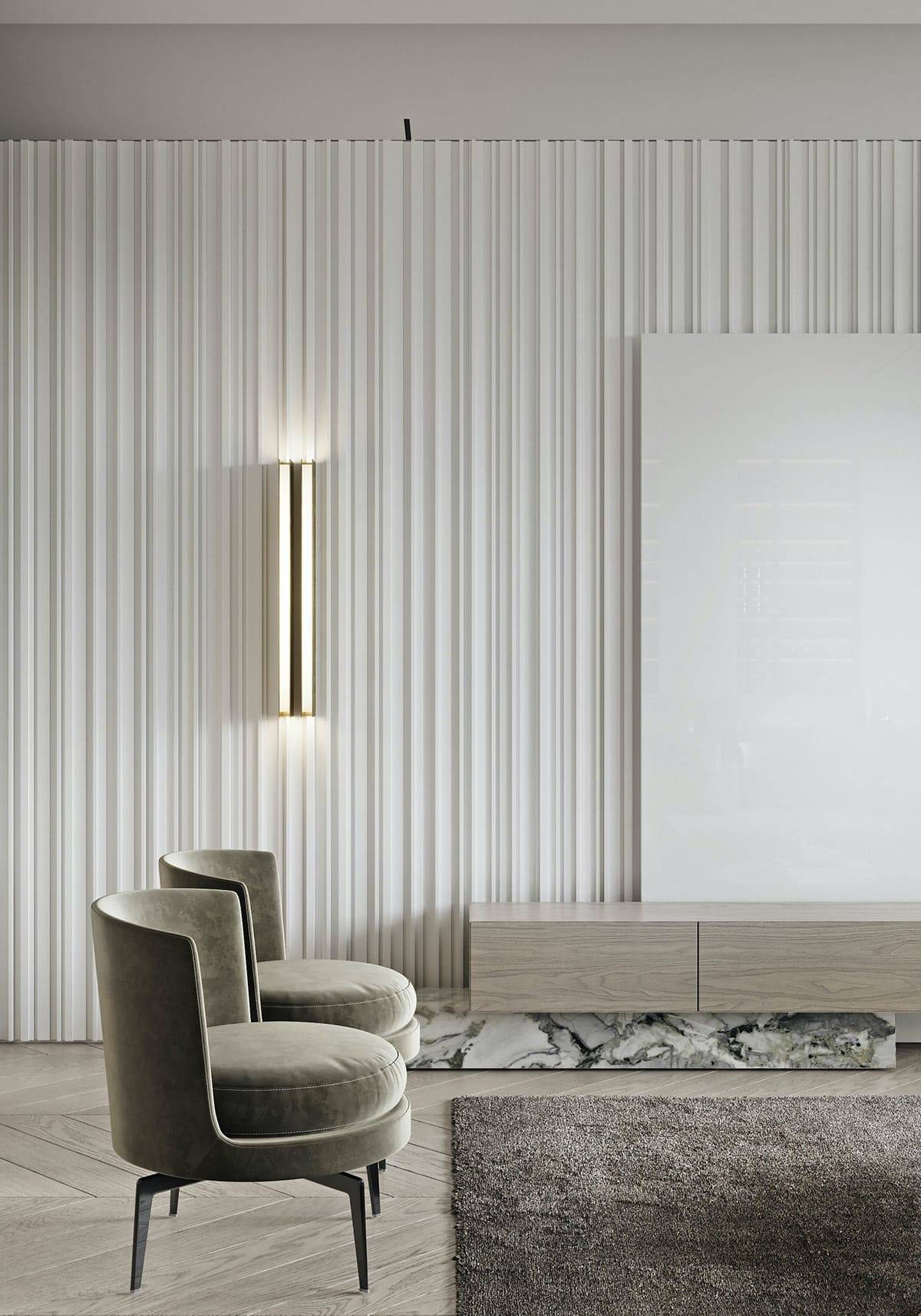 Несмотря на монотонность, серые колеры, за счет правильно подобранных фактур, создают живописный и глубокий дизайн, нежели скучный и пустой.