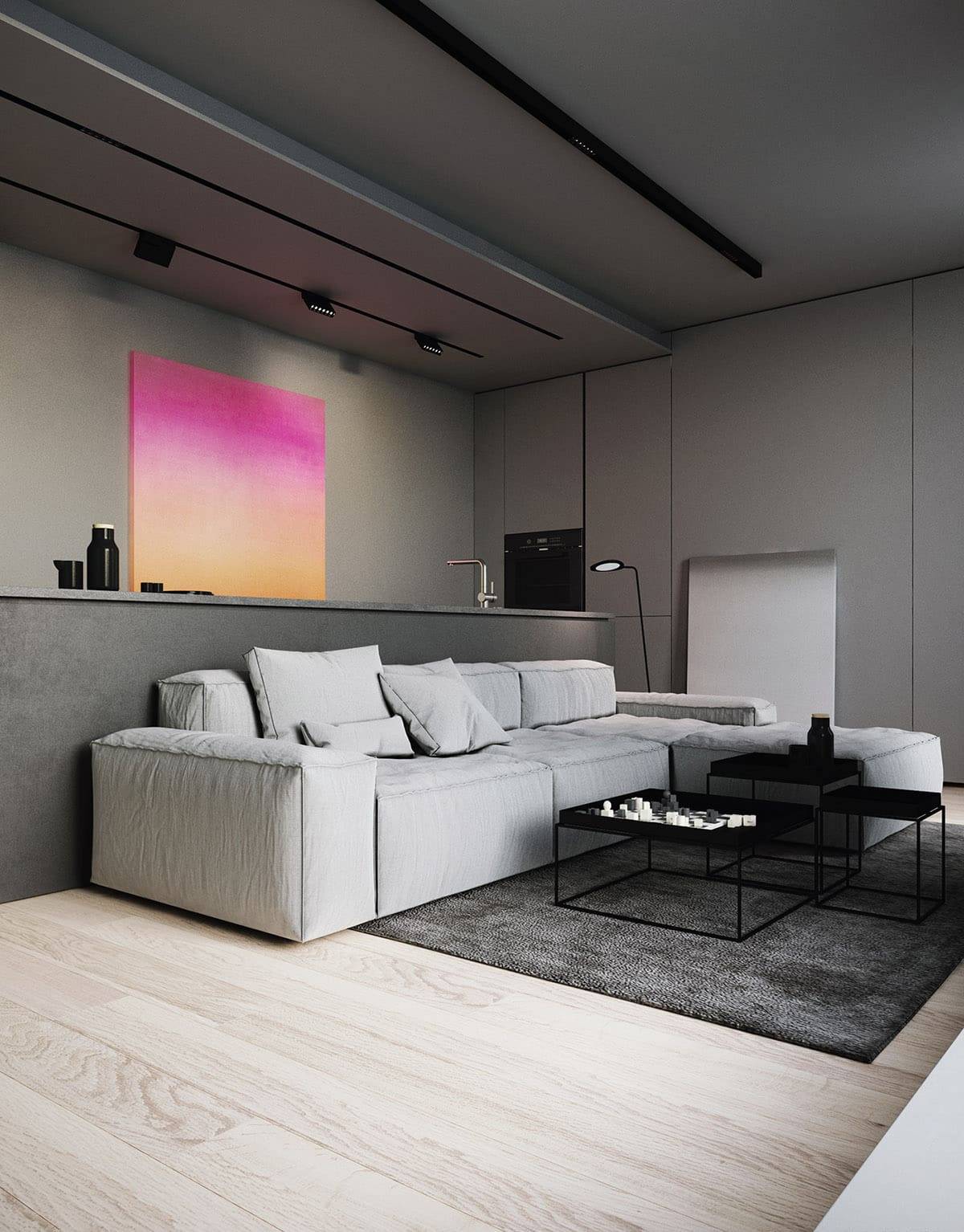 - если гостиная прямоугольная, используйте более темные оттенки серого на торцевых стенах;