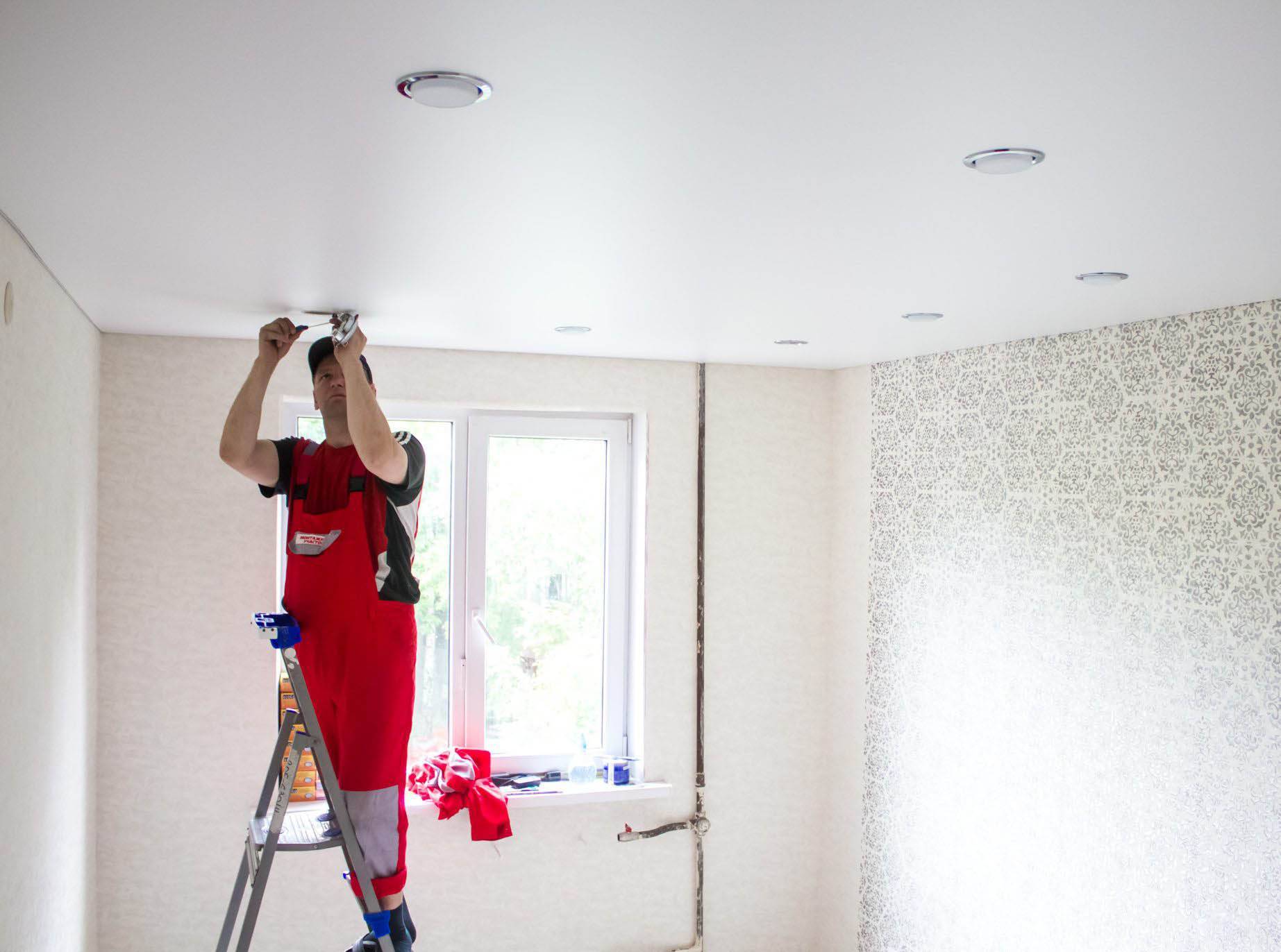 Вторая часть процесса выполняется уже после того, как натяжной потолок готов. Напоминаем, что до начала работ нужно отключить подачу электричества!